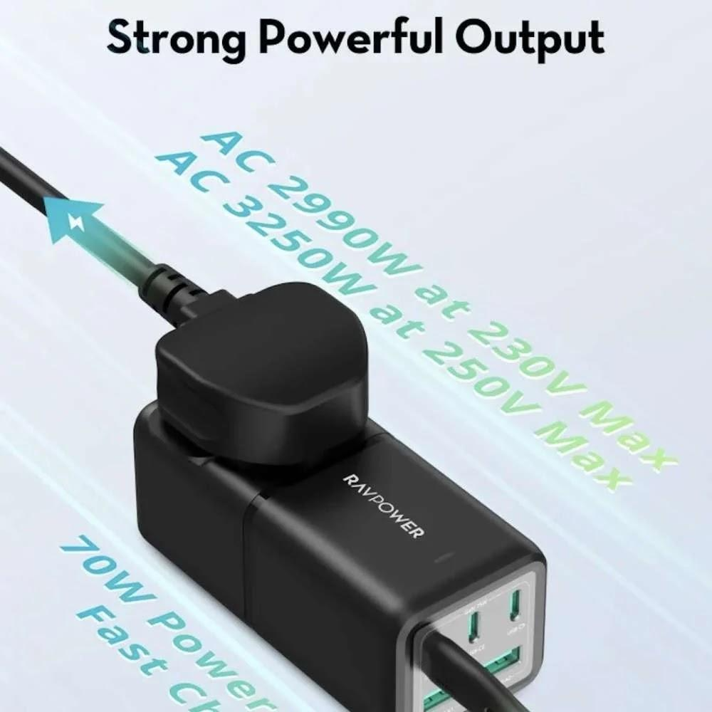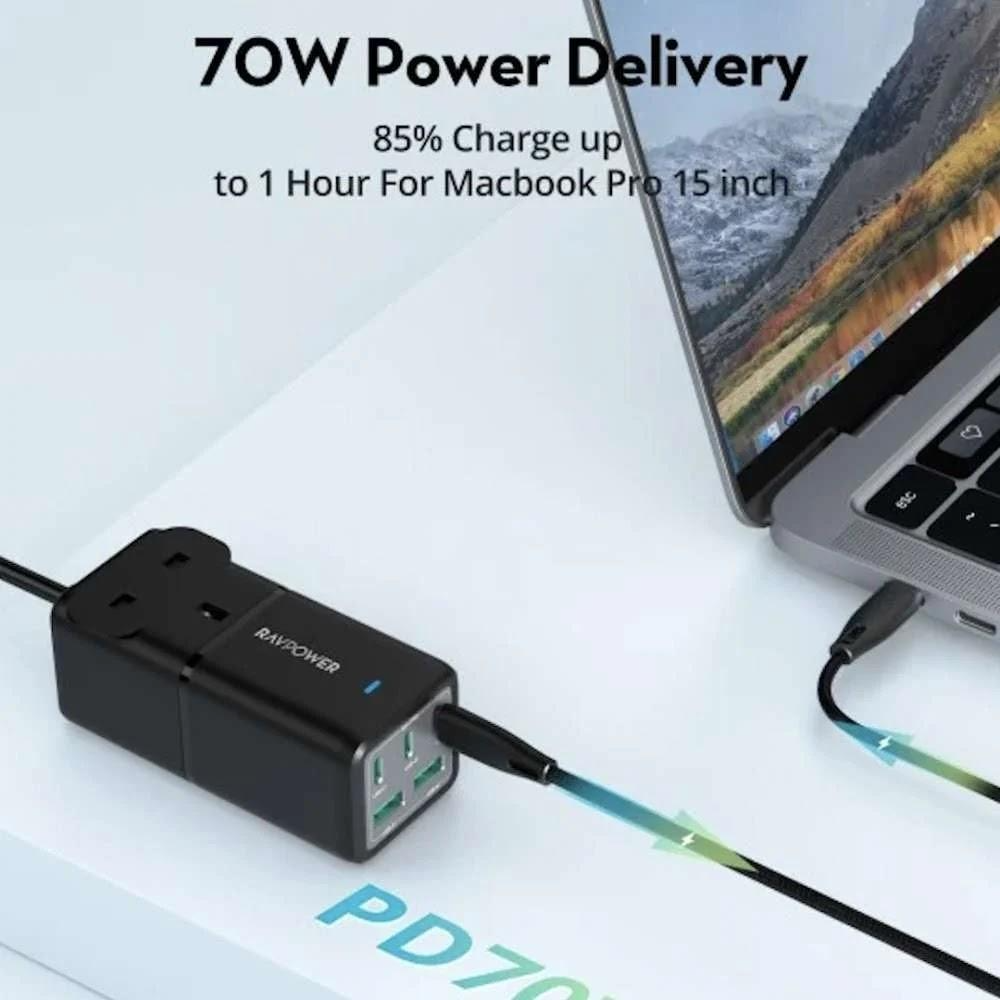 راف باور منصة شحن 70 واط ثلاث منافذ تايب سي ومنفذين USB ومنفذ طاقة + فيش سفر