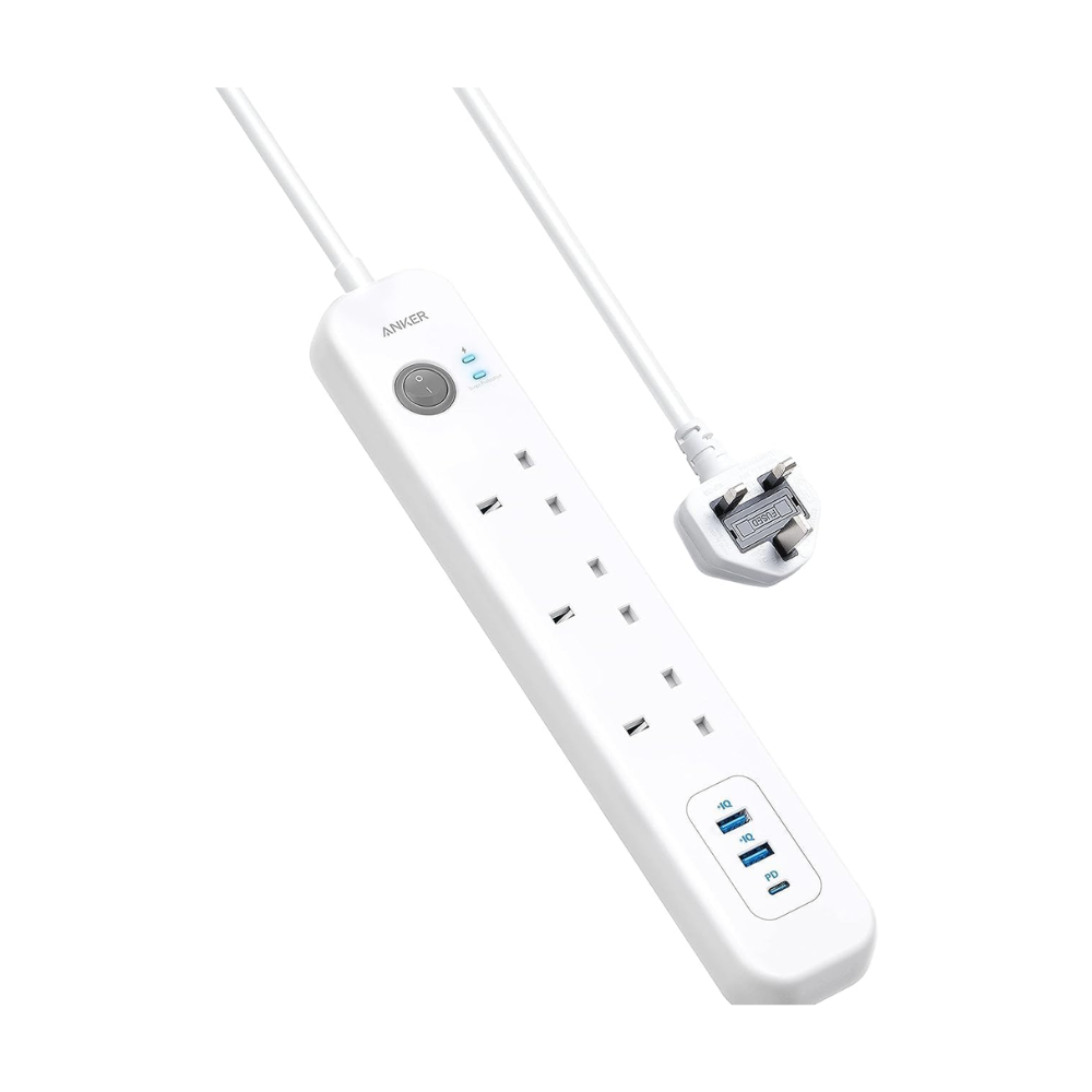 أنكر وصلة تمديد مع منفذ يو اس بي نوع سي بقدرة 18 واط ومنفذين USB باور اي كيو و3 منافذ تيار متردد، شريط طاقة مع شحن USB وحماية من اندفاع التيار للمنزل والمكتب والمزيد