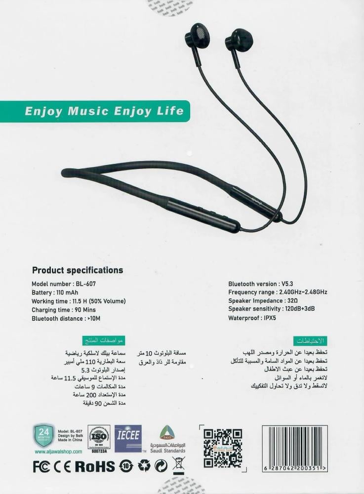 - بفضل البطارية القوية، يمكنك استخدام سماعة بيلك موديل 607 لفترات طويلة دون الحاجة لإعادة الشحن المتكرر، مما يتيح لك حرية الحركة والتمتع بالموسيقى المفضلة على مدار اليوم.