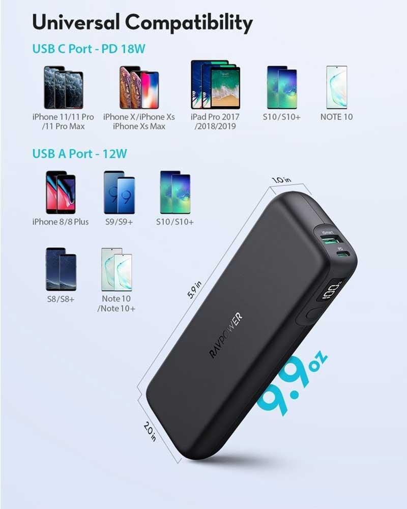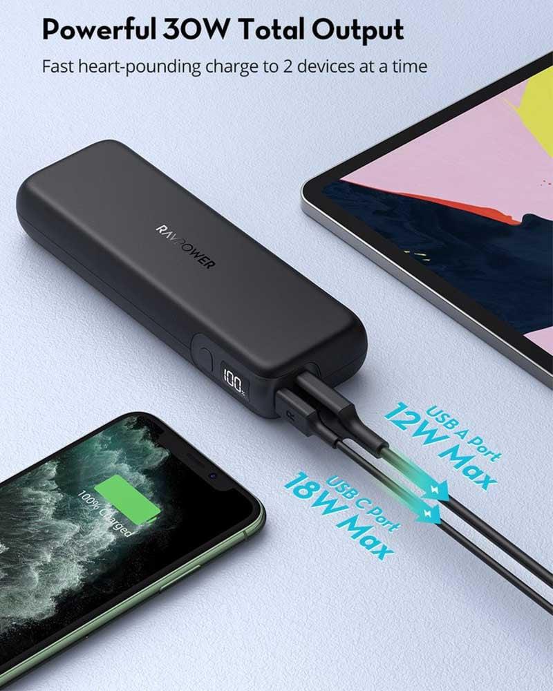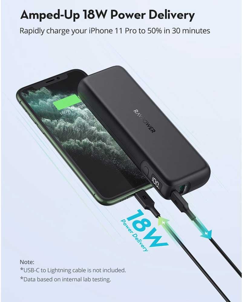 - راف باور يقدم لك شاحن متنقل بحجم صغير وشحن أسرع يستغرق منفذ توصيل الطاقة 15 واط إلى 30 دقيقة فقط لأعاده شحن iPhone 11 pro من 0% إلى 50%بإستخدام كيبل USB-C – lightingمن مميزاته: