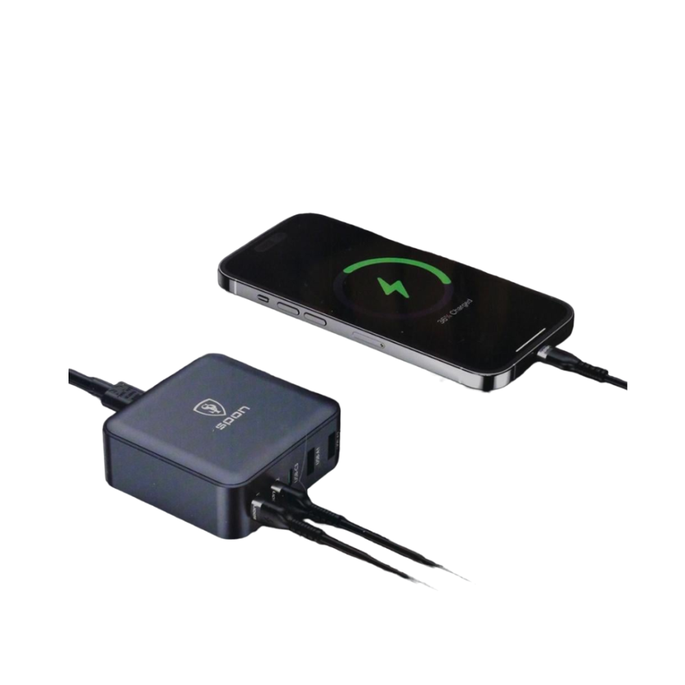 - منافذ متعددة: يحتوي على منافذ USB-C وUSB-A، مما يتيح شحن عدة أجهزة في نفس الوقت.